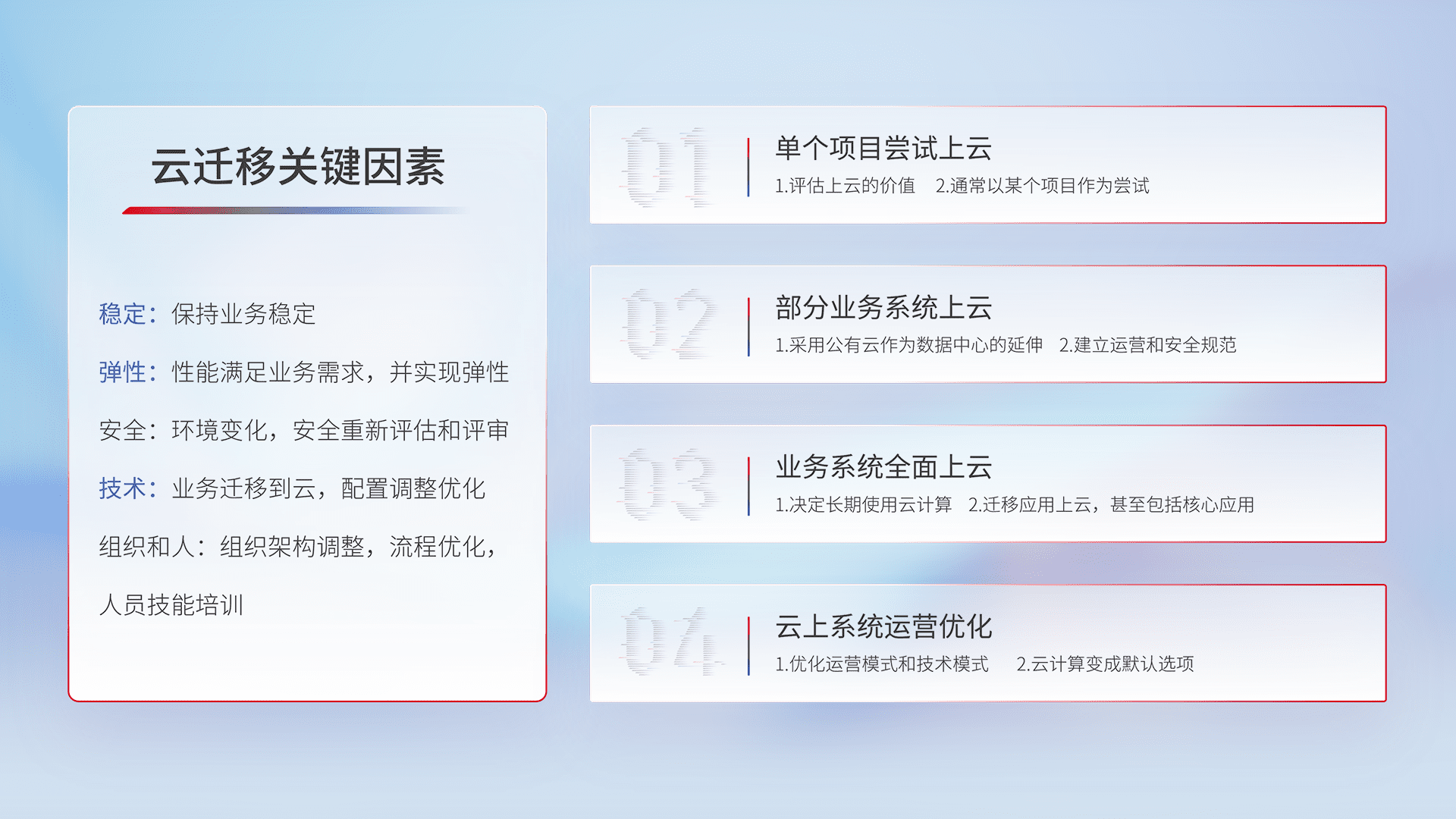 结合实际业务,,,从规划设计、、、、云平台选型、、云原生改造、、、数据迁移、、、集成交付,,,迁移全过程为客户识别最佳上云路径,,,,做好风险识别管理,,,,设计网络架构、、、身份权限、、安全审计合规、、、、操作审计、、、、日志审计、、监控告警策略、、、多站点容灾设计等,,,,对云上基础设施进行整体规划,,,,提升IT治理水平,,以满足弹性、、、、高可用、、、、高性能的需求。。。。