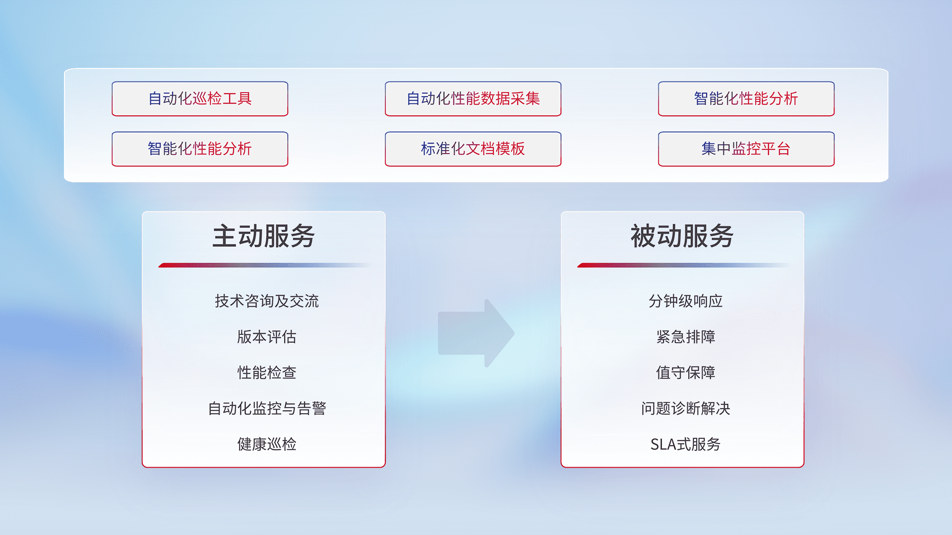 智能化工具和标准化文档,,保障服务质量,,,,提供主动服务(包含技术咨询、、、、版本评估、、、、性能检查、、自动化监控与告警、、、、健康巡检)和被动服务包含(分钟级响应、、紧急排障、、、、值守保障、、、问题诊断解决、、、、SLA服务)。。